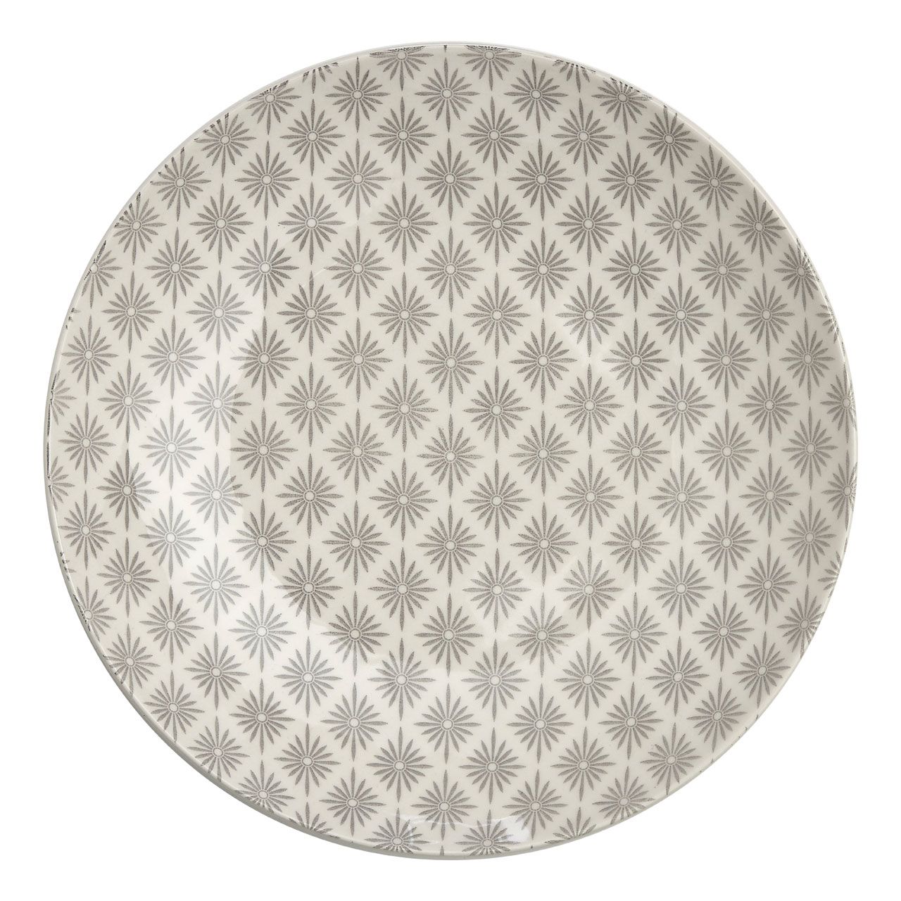 Rautenförmige Blumenmotive zieren die Oberfläche dieses zwölfteiligen Speiseservices. Die grauen Blüten harmonieren perfekt mit dem weißen Hintergrund und machen das Set ideal für skandinavisch inspirierte Tischdekorationen. Das Set besteht aus vier Speisetellern, vier Desserttellern und vier Schüsseln und ist aus glattem Dolomit gefertigt.