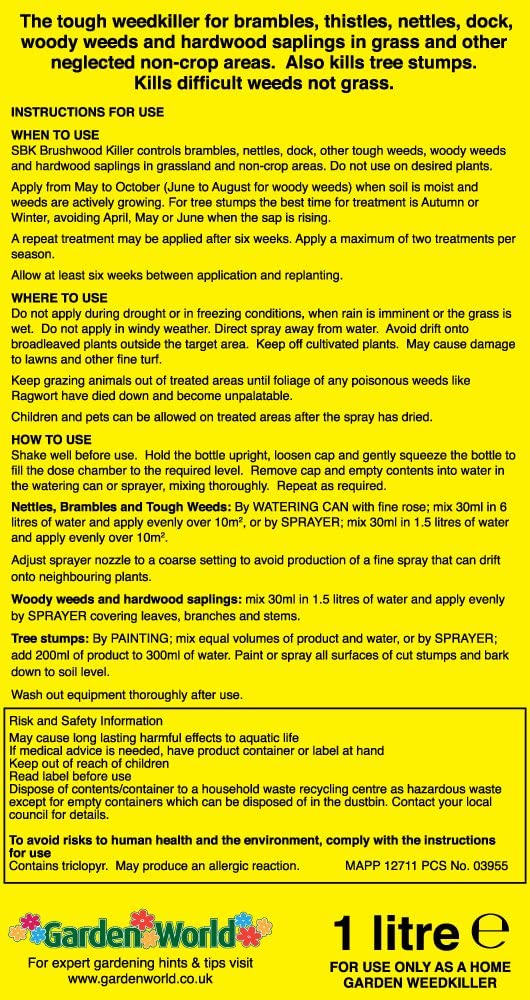 Vitax SBK Brushwood Killer ist ein selektives Unkrautvernichtungsmittel gegen Brombeeren, Brennnesseln, Ampfer, holzige Unkräuter, Laubbaumsetzlinge und Baumstümpfe in Grasflächen und anderen vernachlässigten, nicht landwirtschaftlich genutzten Bereichen. Es schädigt Gras nicht.